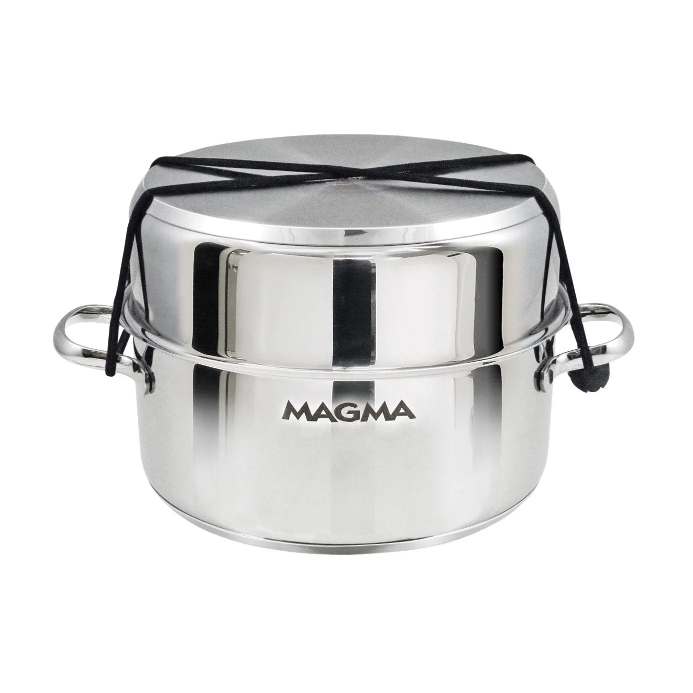 Made of 100% 18-10 mirror polished Stainless Steel, Magma’s Award-Winning, 10-Piece Cookware Set is now available with a Non-Stick coating. Set completely nests and store in less than ½ cu. ft. of cabinet space and are compatible with all stove types, including induction, so it’s perfect for on-the-go BBQ cooking. The Heavy Duty Non-Toxic, PFOA, and PTFE free, Slate Black, non-stick is remarkably easy to clean, will not stain, peel, blister, or flake. The encapsulated Triple-Clad bottoms (Stainless Steel, Aluminum, Stainless Steel) are milled perfectly flat for perfect heat distribution. The Triple-Clad bottoms outer layer uses the highest quality ferromagnetic stainless steel, specifically used to activate the magnetic field in all Induction cooking surfaces. 10 Piece set includes: 5 qt. Stock Pot, 10 in. diameter Sauté/Frying Pan, 3 qt. sauce pan, 2 qt. Sauce Pan, 1-½ qt. sauce pan, lid that fits all saucepans, a lid for Sauté/Frying Pan/Stock Pot, (2) removable handle, and a convenient bungee storage cord. Cookware is oven safe to 500° F (excludes removable handles).