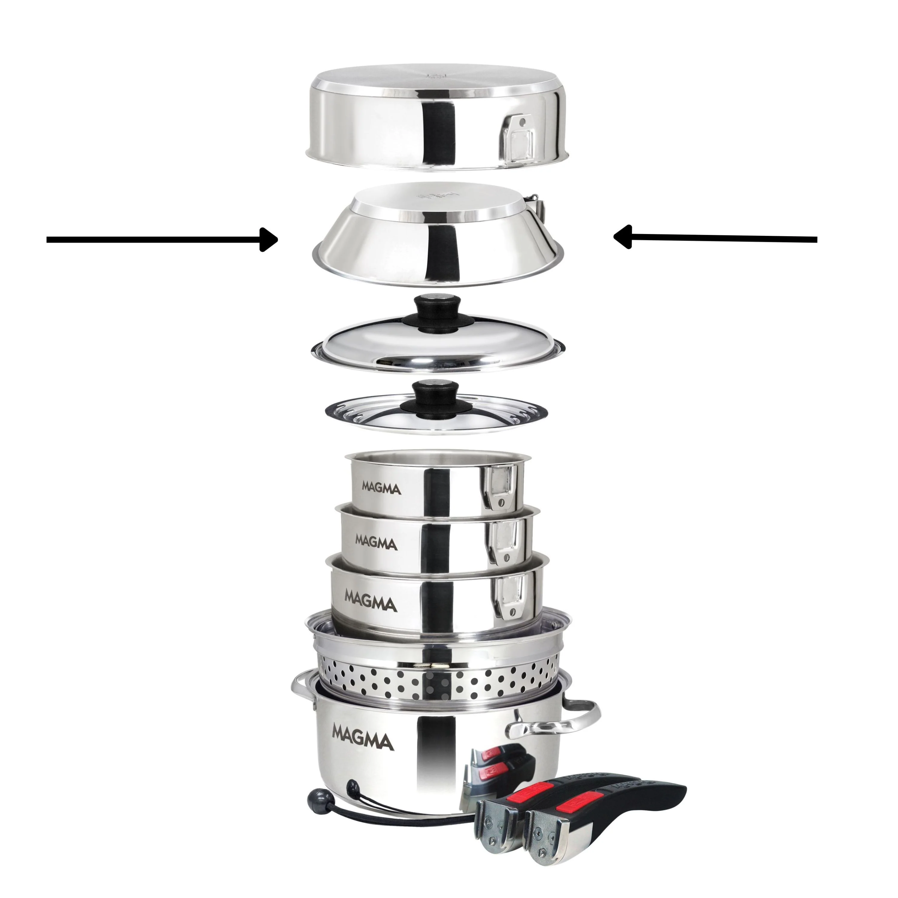 Prepare meals like a chef with Magma’s professional nesting Stainless Steel omelette / sauté pan. Designed to nest and store inside any Magma cookware set, constructed of 18-10 stainless steel, and conveniently uses Magma’s removable handle (supplied with cookware sets). Equipped with a heavy duty non-toxic PFOA and PTFE free, Slate Black, non-stick coating which is remarkably easy to clean, will not stain, peel, blister, or flake. The encapsulated Triple-Clad bottom (stainless steel, aluminum, stainless steel) has been milled perfectly flat for superior even heat distribution. The Triple-Clad bottoms outer layer uses the highest quality Ferromagnetic Stainless Steel, specifically used to activate the magnetic field in all induction cooking surfaces. Pan is oven safe to 500° F (excluding removable handles). With superior construction and craftsmanship this pan a must-have addition to your Magma cookware set.