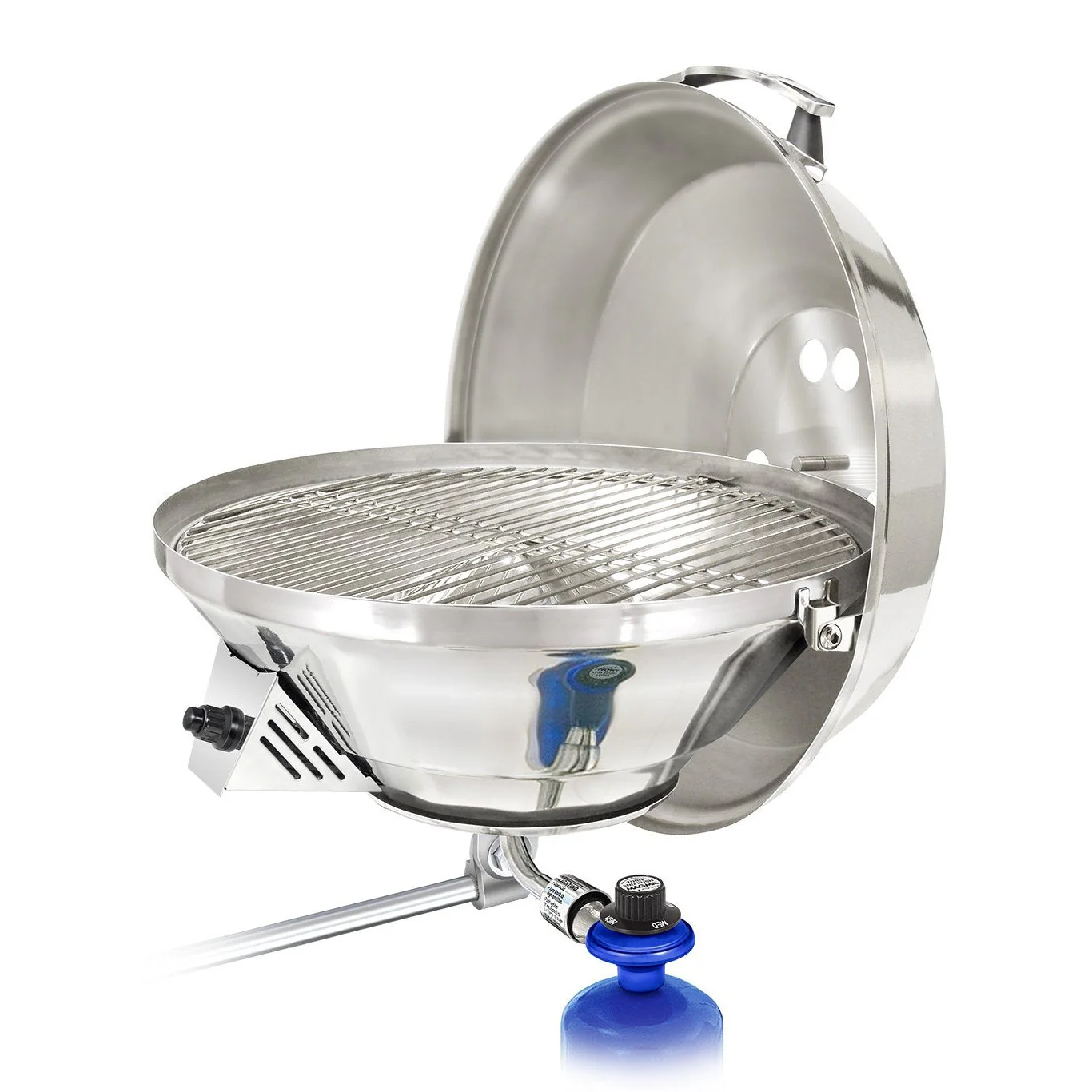 Enhance your grilling experience with Magma’s Marine Kettle 3 Combination Stove and Gas Grill, the ultimate on-board barbecue solution. This versatile, portable grill includes features that are both useful and user friendly including an electronic ignition system, powered by a single “AAA” Alkaline battery (included), a heavy-duty inner safety shell that keeps the outside of the grill cooler, guards against discoloration, while adding years of life to the grill. Made of mirror polished, 304 marine-grade stainless exterior finish provides superior corrosion resistance, in even the harshest environments. Dependable, even in a stiff breeze, due to a virtual blow-out proof turbo venturi tube design, patented heat distribution system and burner, which directs more heat to the cooking surface. The swiveling control valve / regulator is designed to connect to 1lb. disposable propane fuel canisters and allows for quick, safe canister exchanges. Grill can also be easily adapted to any existing on-board LPG (propane) or CNG (natural gas) fuel system. Additional features include a balanced hinged lid that won't slam shut as the boat rolls, polished, 18-9 Stainless Steel "Stay Cool" handle with air cooled supports, and Stainless Steel L-bracket and clamp assembly to provide easier, more positive level mounting. These new features combined with Magma's patented radiant plate and dome system, make this the only boat grill that is truly a grill, stove, or oven -- a great advantage to boats without a galley, or if the crew just wants to cook outdoors. Magma offers the largest selection of mounting options (sold separately) to customize the grill for your needs. Fuel canister not included.