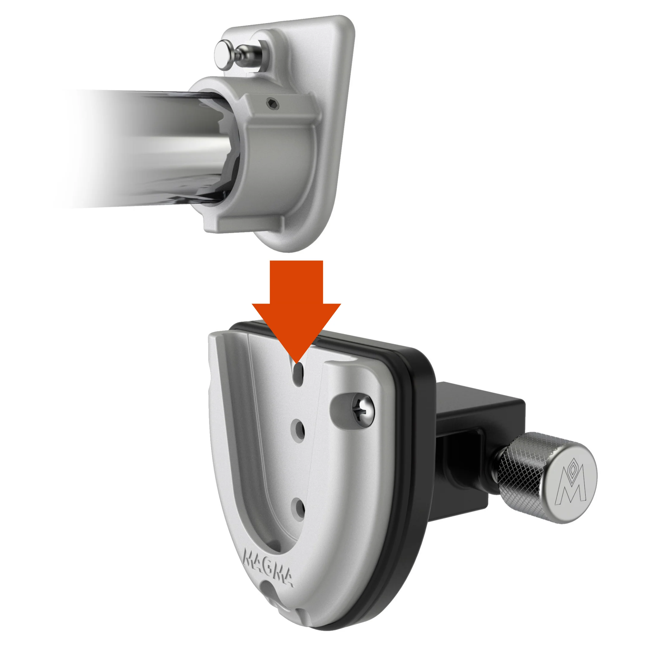 Perfect for tailgating or out in your RV, conveniently mount any of the Magma marine rectangular grills, Crossover Single Firebox, party table or most Magma tables with this slide mount to any 2" hitch receiver. Constructed of marine grade stainless steel tubing and cast aluminum components. Includes a quick release clamp for easy and quick mounting and for complete rotation, knob adjustment allows grill to level by 20 degrees. When not in use, simply pull the pin to release the mounting arm from the slide mount bracket.